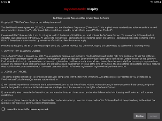 Kullanıcı, bu uygulamayı indirmeyi, yüklemeyi ve kullanmayı kabul ederek; kullanıcının gizlilik haklarına saygı göstererek kişisel bilgilerini bu uygulama aracılığı ile toplayacağımızı, saklayacağımızı ve/veya işleyeceğimizi, ayrıca burada ve destek sayfasında (https://myviewboard.com/support) belirtilen şartları okuduğunu ve kabul ettiğini beyan eder; AKSİ TAKDİRDE, KULLANICI KABUL ETMEZSE, KULLANICI HERHANGİ BİR HİÇBİR YARDIM YAPMAMALI, BU UYGULAMAYI KULLANMAYI DURDURMALI VE BU UYGULAMAYI KALDIRIP KALDIRMALIDIR.