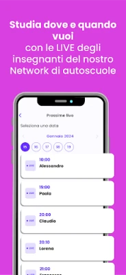 All’interno dell’app potrai seguire, tutte le volte che vuoi, le LIVE interattive con gli insegnanti del nostro network di autoscuole. E se non riesci a partecipare? Non preoccuparti, grazie alle LIVE registrate, potrai sempre vederle in un secondo momento, anche di notte.