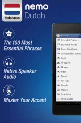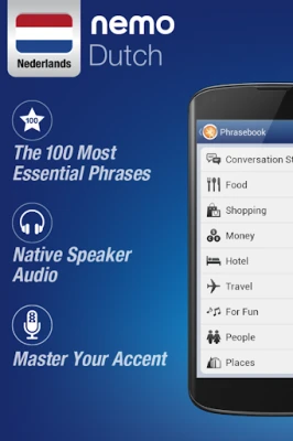 Nemo is designed to start you speaking the most useful words in Dutch immediately and confidently. With millions of downloads from around the world, Nemo is now available for Android phones and tablets.
