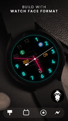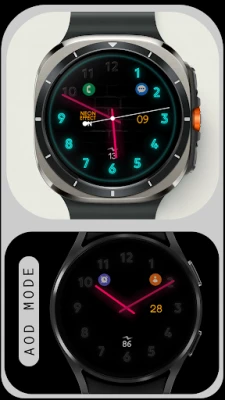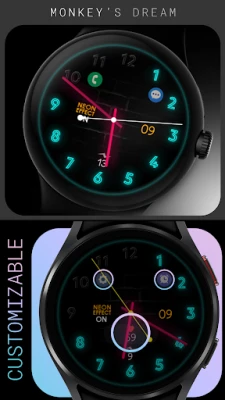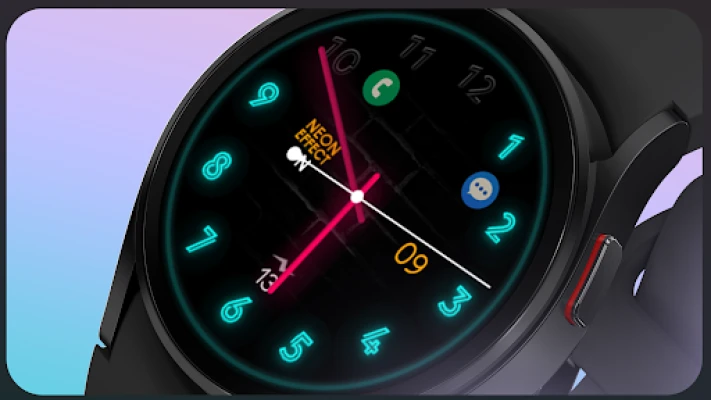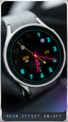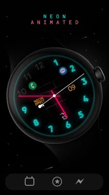 Bright and vibrant, this analog watch face for Wear OS features a neon effect animation with bold colors. Great for those who want a modern and eye-catching look on their smartwatch.