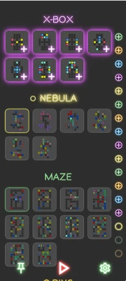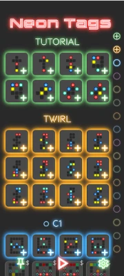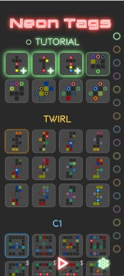Neon Tags has over 165 unique levels. 24 levels are available for FREE, the rest can be purchased at any time. All levels are divided into sections, so you can start each section you want and go through the levels in the section one by one, from easy to very difficult.