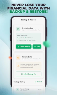 Quickly add all your assets (like savings, investments, real estate) and liabilities (like loans, credit cards). The app calculates your net worth in real-time, so you always know where you stand financially.