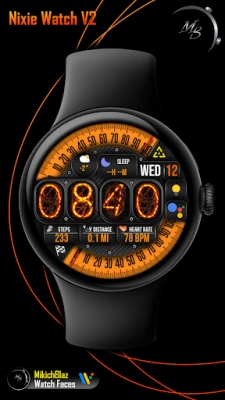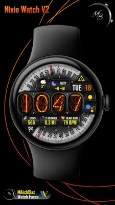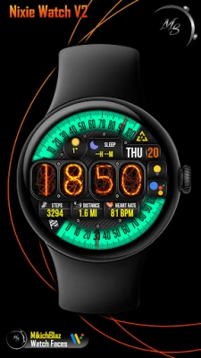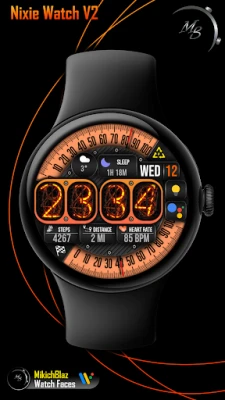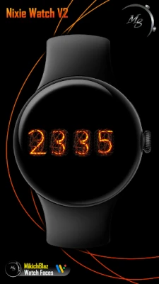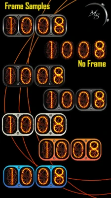 Time: Big number Nixie tube numbers, 12/24h format (depending on your phone system time settings) The bezel around the time can be customized, few styles available.