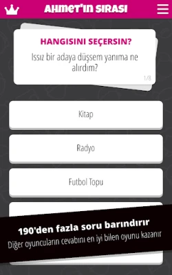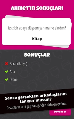 Kendin hakkındaki soruları cevapla ve arkadaşların senin cevabını tahmin etsin. Acaba arkadaşların seni düşündükleri kadar iyi tanıyorlar mı? Peki ya sen onları tanıyor musun? Diğer oyuncuların cevabını en iyi bilen oyunu kazanır.