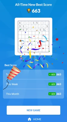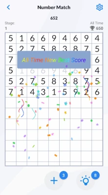 The emptier the board is, the better your score! Score the most points by crossing out all the numbers on the field (+150 points), and removing entire rows (+10 points). Score +4 points by connecting numbers that are far apart.