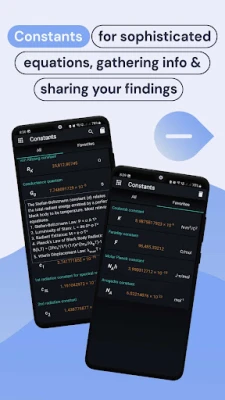 In Constants Mode there are 63 known constants from Physics, Chemistry and any other field used in Science such as Planck constant, Boltzmann constant and many others.