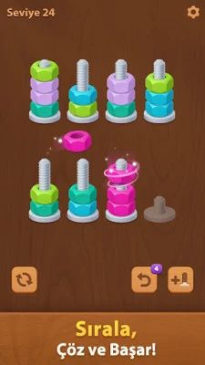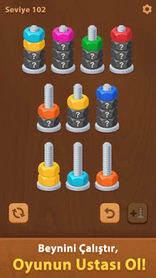 ""Nuts Sort Journey"" sadece renkleri eşleştirmekle ilgili değil; zihninizi zorlamak ve stratejik düşünmenizi geliştirmekle ilgili.Oyun, basit ve sezgisel bir kontrol yöntemi sunarak oyuncuların çeşitli renklerdeki somunları belirlenmiş dizilere kolayca seçip sıralamasına olanak tanır.Her seviye karmaşıklığı artacak şekilde özenle tasarlanmış olup, keskin gözlem ve mantıksal beceri gerektiren karmaşık kombinasyonlar ve daha sıkı kısıtlamalar sunmaktadır.