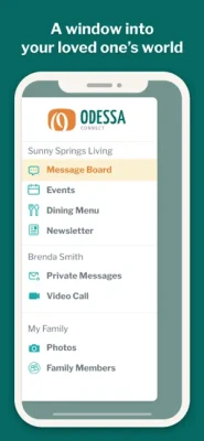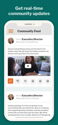 Family members can also communicate with facility staff by receiving and reacting to messages, photos, videos and YouTube links. Viewing community information and updates like dining menu, newsletter and events are also available.