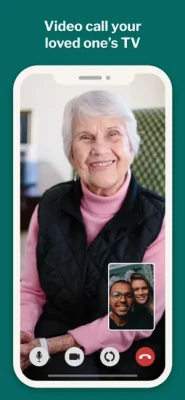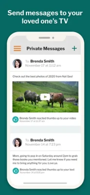 Enables family members easy and persistent access to communicate with their loved one through their loved one’s TV. Types of content include messages, videos, photos and video calls.