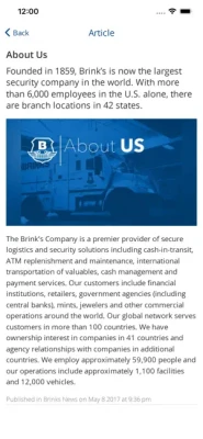 One Brink's is the company mobile app solution for team members of Brink's Inc. One Brink's has access to company news and information, Team Resource Groups, careers, and team recognition.With push notifications, you'll know what's going on — always and everywhere. Please contact the One Brink's app administrator for support.