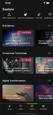 Ma l'apprendimento non si ferma qui! Nella sezione "Esplora", ti invitiamo a immergerti completamente nel nostro ricco catalogo di contenuti. Sfoglia tra caroselli e card pieni di corsi, tutorial e risorse educative che ti ispireranno a esplorare nuove passioni e acquisire nuove competenze.