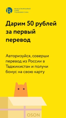 OSON – это online сервис денежных переводов в Таджикистан с любых российских платежных карт на расчетные счета и карты Международного банка Таджикистана, а так же на любые карты "Корти Милли" всех банков Республики.