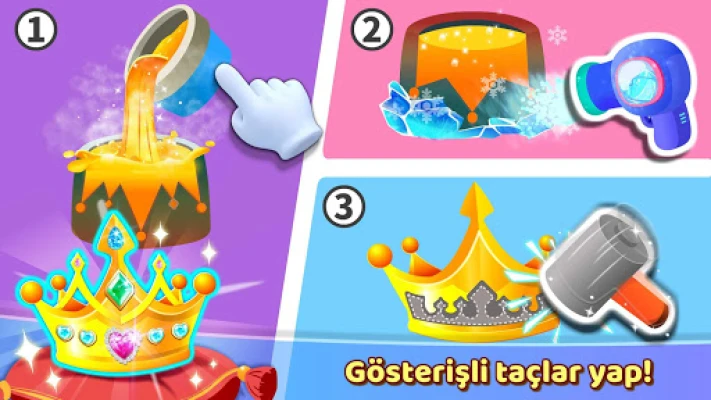 Şimdi de prensler için taç tasarlayalım! Makineyi çalıştır ve metali erit. Eriyince, metali kabın içine dök ve soğumaya bırak. Sonrasında metal taç şekillenir! Tasarım için hangi modeli istersin? 3 modelden birini seçebilirsin. Modeli tacın üzerine işlemek için küçük bir çekiç kullanman gerek. Birkaç değerli taşla süsle, işte tacı kolayca yaptın!