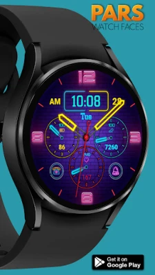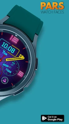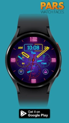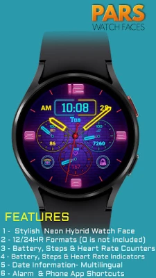 Pars Neon Glint Hybrid Watch Face is designed for WearOs devices and compitable with Wearos Api 34+ devices.