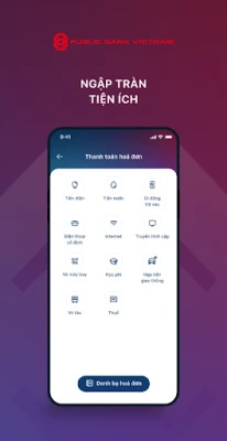 Thanh toán hóa đơn cho các dịch vụ thiết yếu như điện, nước, truyền hình cáp, internet, vé máy bay, điện thoại… (Pay bills for essential services such as electricity, water, VTVCab, internet, air tickets, telecommunication and many more).