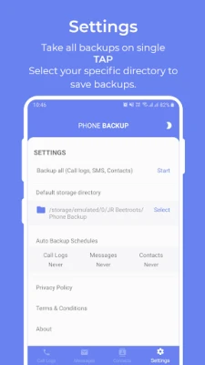 Phone Backup is an application that would be complete backup your call logs, messages and contacts into your phone storage for backup and restore when ever you want to restore into original state.