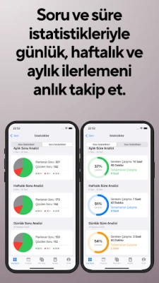Net artışı, çözülen soru sayısı, harcanan toplam süre gibi detaylı istatistikler ile gelişiminizi grafikler üzerinden takip edin.