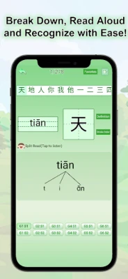 Pairs Chinese characters with their Pinyin readings and meanings. Users build recognition through repeated exposure, learning pronunciation, form, and usage in a natural way.