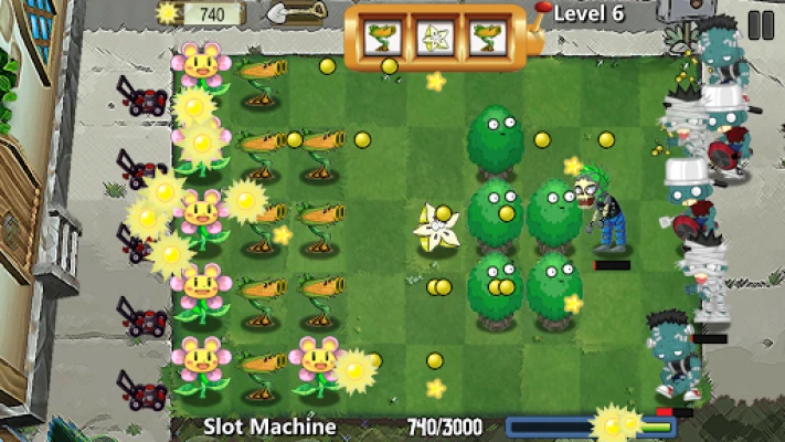 2. Slot Machine: Win random plants by playing the slot machine as you battle endless zombie waves to reach a sun collection goal.