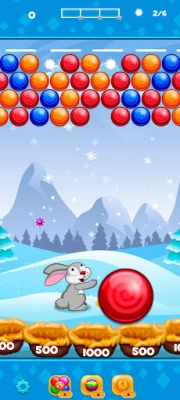 The cute rabbit image serves as the game's protagonist. Players aim and launch bubbles, connecting and eliminating bubbles of the same color as they progress through the snow-themed levels.