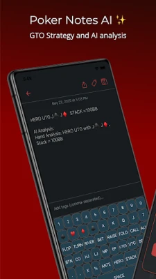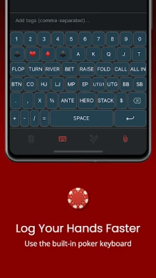 Poker Keyboard Integration: Enter hands lightning-fast with a specialized poker keyboard built into the app. It includes suit symbols and common poker shorthand, so you can record cards (e.g. ♥♣♦♠), bets, and actions with just a few taps. This feature makes live poker note-taking easy and consistent.