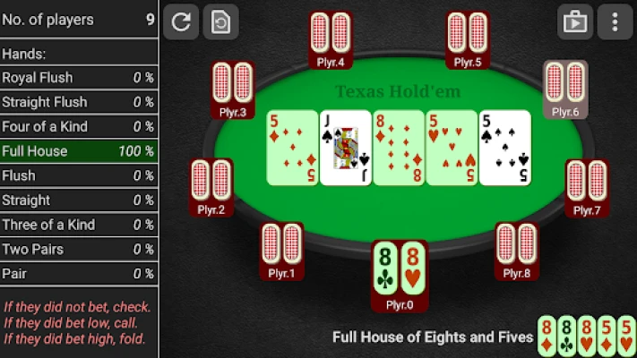 Two operating modes are offered: - Guided Mode: This mode shows instructions to be followed while playing a real game in the lower left box for every betting round (red text). - Best Hand Mode: This mode will be accessed at the moment you set a card of another player and will indicate the best hand among all the players with known cards in the lower left box (yellow text).