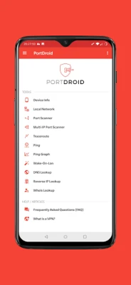 • Port Scanner: Probe any IP for open TCP ports with the added advantage of banner grabbing. Discover web services and let PortDroid suggest external applications for known protocols (ssh, telnet, http, https, ftp, smb etc.).