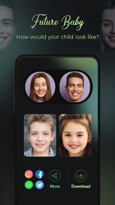 👶 Gelecekteki Bebeğiniz; Eşinizle birlikte çocuk sahibi olmaya karar veriyorsunuz. Ama siz ikiniz onun nasıl görüneceğini merak ediyorsunuz. Yapay zekamızın kullandığı bir teknoloji var. Bebeğinizin neye benzeyeceğini tahmin ediyor. Adeta ultrason görüntüsü gibi ama çocuğun 4-5 yaşındaki hali. Ayrıca, Face Edit Smile Editor uygulaması ücretsizdir