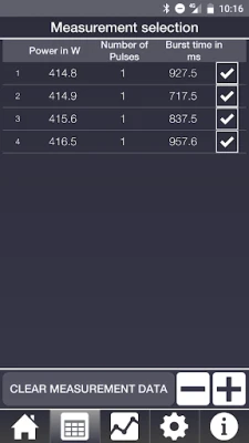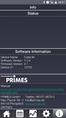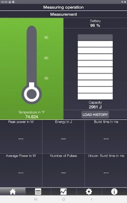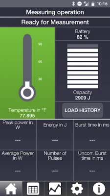 The Bluetooth connection with the PRIMES measuring device allows the measured values (laser power, pulse length and energy per pulse) to be displayed numerically and graphically on the mobile device. The app also shows a device status overview (temperature, capacity, status messages).