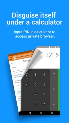 Private Browser is the best privacy keeper on web browsing. Private Browser can disguise itself to be a calculator on your phone and when you input your PIN in the calculator it turns to a full featured browser with super speed.