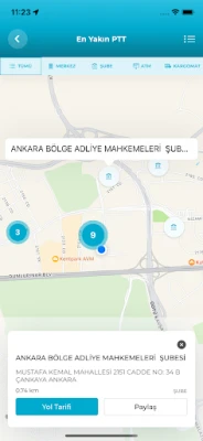 Merkez, şube, atm , kargomat noktalarını harita üzerinde görüntüleyerek ilgili PTT hizmet noktasına rota oluşturabilir.