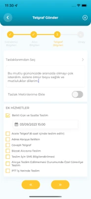 Özel gün ,tebrik ve davetiye için uygulama üzerinden kolay bir kullanımla giriş yaparak veya giriş yapmadan telgraf gönderebilir, takip ve iptal işlemlerini gerçekleştirebilir.