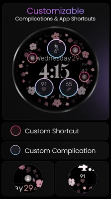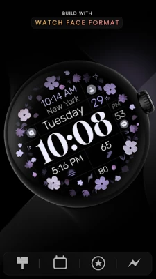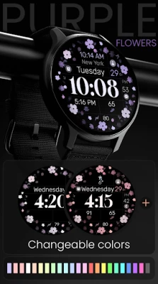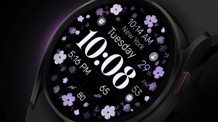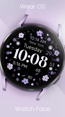 This digital watch face for Wear OS features a floral wreath design with soft purple tones, a black background, and a big, easy-to-read font. It includes custom app shortcuts, complications, and changeable colors, making it ideal for a personalized and stylish look.