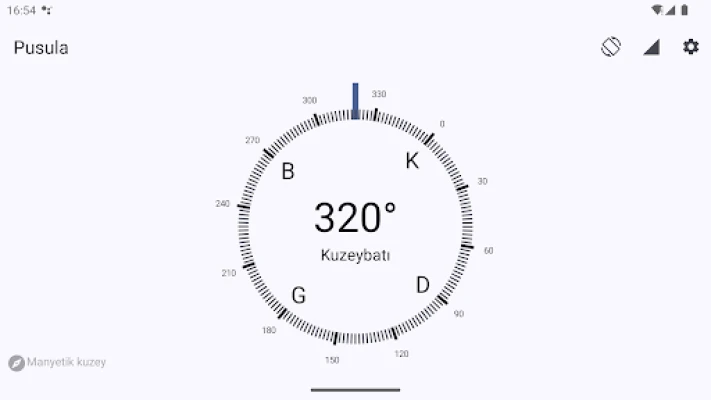Özellikler: * Manyetik kuzeyi gösterir * Kardinal yönü ve tam derecesini gösterir * Sensör durumunu gösterir * Otomatik gece modu * Reklamsız * Can sıkıcı şeyler yok