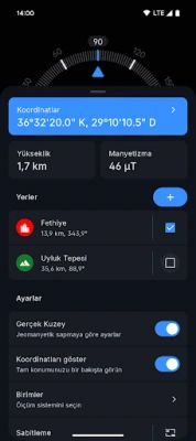 • Koordinatlar: Konumunuzun tam koordinatlarını ve yüksekliğini görün. DMS, DDM, DD, UTM ve MGRS gibi formatları destekler.