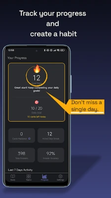 Just swipe through a few cards each day — 5–10 minutes is enough to build lasting skills. The system adapts to you: cards you answer correctly appear less often, while the tricky ones come back sooner, right when your memory needs a boost.