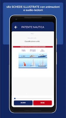 Questa App comprende tutti i 1435 quiz base e i 250 quiz vela aggiornati al nuovo sistema d’esame. Il punto di forza di questa App è la suddivisione degli argomenti ministeriali in 183 schede didattiche con immagini, schemi e animazioni accompagnate da altrettante audiolezioni. Questo sistema ti consente di memorizzare facilmente e velocemente tutti i concetti necessari per la risoluzione dei quiz.