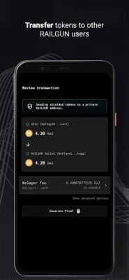 Railway makes it easy to maintain your privacy when sending, receiving and storing your tokens and stablecoins. Using advanced zkSNARKs privacy technology, Railway ensures that you can send and receive ERC-20 tokens without revealing where they come from or where they have gone – even on Etherscan. Once you shield tokens, your transactions are private and untraceable, and the balance you maintain is private.