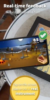 You will improve your reading and rhythm skills step-by-step by tapping on a virtual percussion instrument or by making your high scores with real-time feedback! Turn on the microphone in the app and improve your rhythm skills with a real instrument - a drum, tambourine, or drumsticks. You can even clap along!