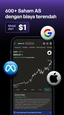 • Akses 600+ saham Amerika dan ETF seperti Apple (AAPL), NVIDIA (NVDA), Tesla (TSLA), Google (GOOG).