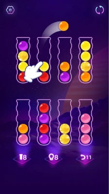 3. Topları tüpler arasında stratejik bir şekilde hareket ettirerek aynı renkli tüm topları bir tüpte toplayın ve ball sort puzzle başarısını elde edin!