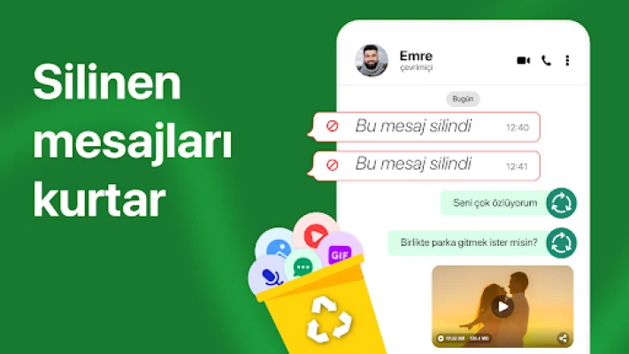 Uygulamanın silinmiş medya özelliği ile fotoğraf, video ve belge gibi silinmiş medya dosyalarını kolayca kurtarın. İster video kurtarma, ister silinmiş fotoğrafları geri yükleme veya önemli belgeleri kurtarma olsun, bu uygulama sohbetlerinizden silinmiş medyayı kolayca geri yüklemenizi ve bunlara erişmenizi sağlar. Silinmiş medya özellikleriyle silinmiş medyayı güvenle geri yükleyebilir ve bunlara anında erişebilirsiniz.