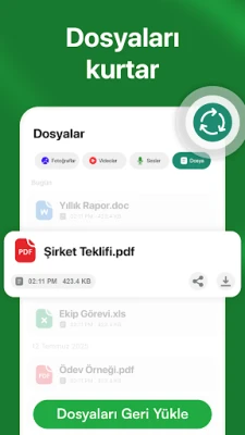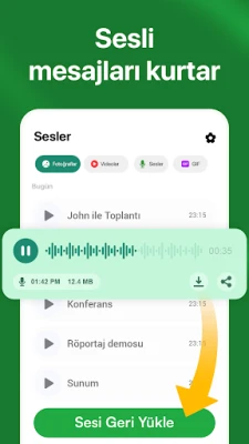 Silinen mesajları geri yükleme uygulaması, silinen sesli notları ve sesli notları zahmetsizce geri almanızı sağlar. Önemli sesli notları ve sesli notları kolayca kurtararak değerli kayıtlarınızı bir daha asla kaybetmemenizi sağlar. Bu özellik, tüm temel ses içeriklerini geri yüklemeyi kolaylaştırır.