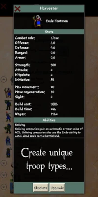 Rising Empires 2 features a rich and large technology tree and loads of buildings ranging from regular marketplaces to structures unique to specific races. Expand by building both settlements and fortifications. And even better: design your own troop types and try to master the advanced combat system with your own strategy. Make war against other empires, undead Ghouls, raging Minotaur clans, secretive Lizard men and powerful Dragons!