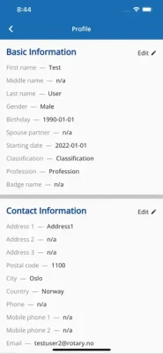 Rotary Norway allows easy management of member profiles, including basic, contact and work information.