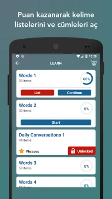 - Yeni kelime öğrenerek, pratik ve tekrar yaparak puan topla. Topladığın puanlarla sık kullanılan cümle kalıplarının ve grupların kilidini aç.