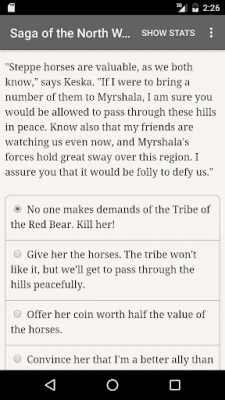 "Saga of the North Wind" is a 300,000-word interactive fantasy novel by Tom Knights, where your choices control the story. It's entirely text-based—without graphics or sound effects—and fueled by the vast, unstoppable power of your imagination.
