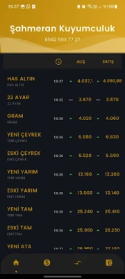 Şahmeran Kuyumculuk Sarraf Bilgi Yönetim Sistemi. Sarrafın anlık altın fiyatlarını detaylı olarak takip edebilirsiniz. Altın miktarının toplam fiyatını öğrenmek için dönüştürücüyü kullanabilirsiniz. Sarrafa ait iletişim bilgilerini öğrenebilirsiniz. Portföy sayesinde sahip olduğunuz altın veya dövizin miktarını kaydedip istediğinizde tekrar güncel kurlar ile değerini inceleyebilirsiniz.