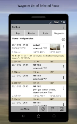 ➤ An editable waypoint-list for each route of your trip lets you keep a complete nautical ship's log in an intuitive manner. Sail-Log will allow you to enter text, choose from a set of logbook entries or shoot photos in-app as well as import them at a later time. Many different options are available for convenient storage of trips, routes and logs.