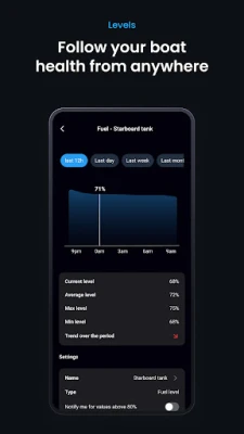 Track battery status, fuel, water, and waste levels, and monitor your boat's performance wherever you are. Record every detail of your voyages—speed, route, and weather conditions—automatically saved in a comprehensive digital logbook, giving you an unparalleled view of your journeys.